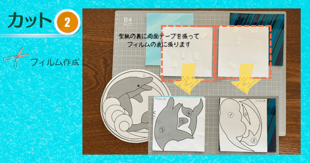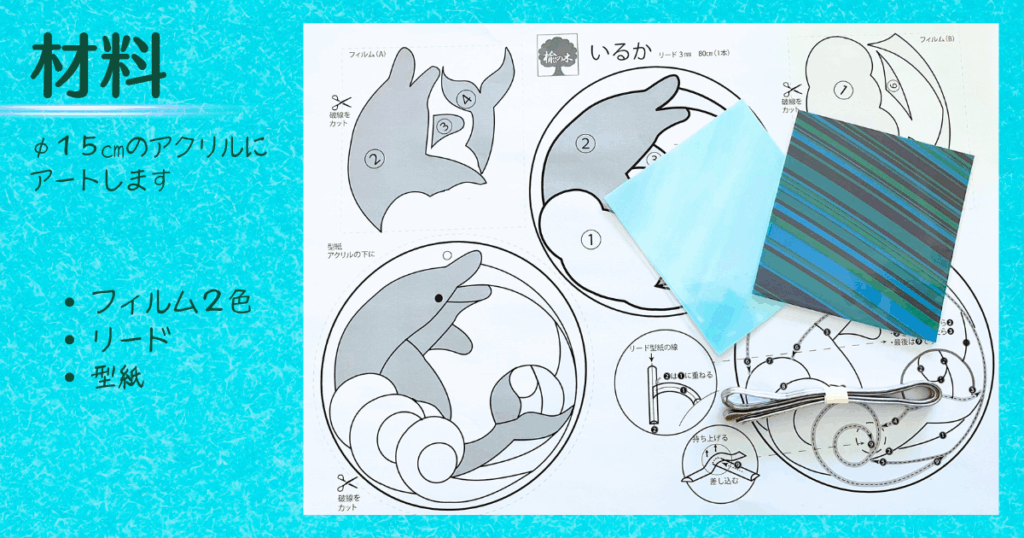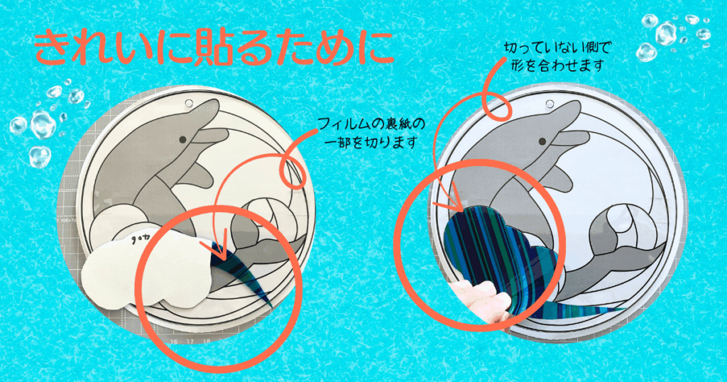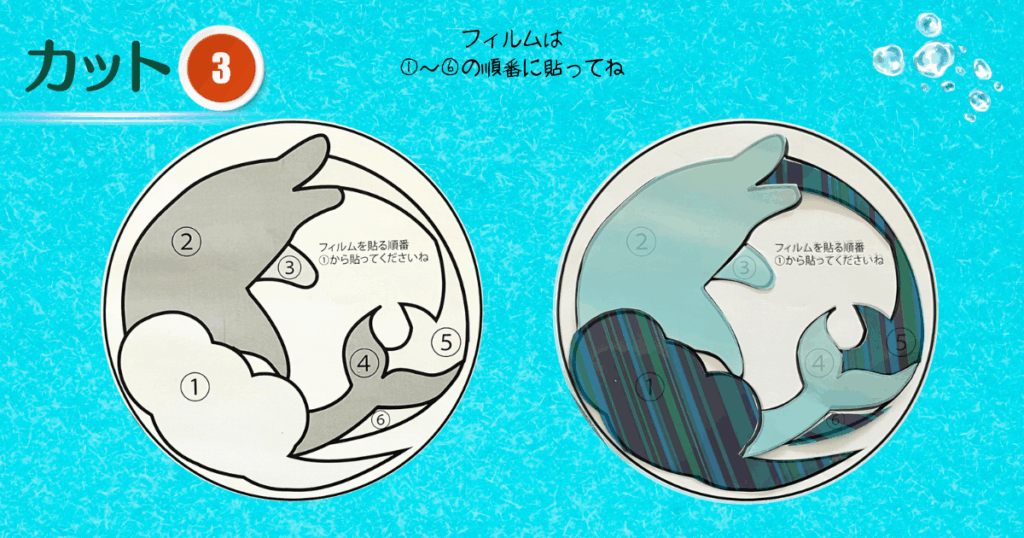 キラキラ光る透明素材を使って、まるで海の中を泳いでいるようなイルカのアート作品を作ります。